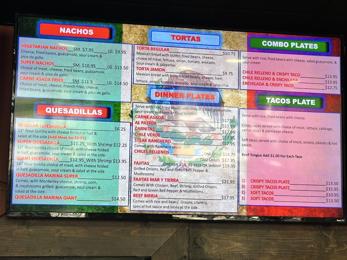 - A la Carte and Other Dishes: Includes items such as beef enchiladas, quesabirria tacos, asada tacos, chile relleno, menudo, fajita mix, chicken quesadillas, and tacos with a variety of fillings like al pastor and tough meat.